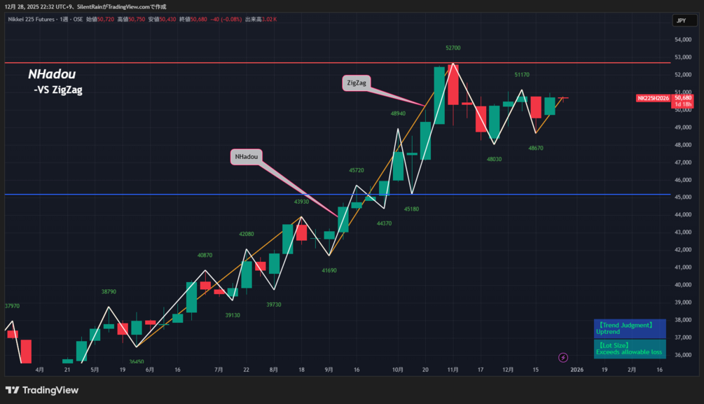 NHadou は、ダウ理論をベースにした独自ロジックを搭載した TradingView 用インジケータです。